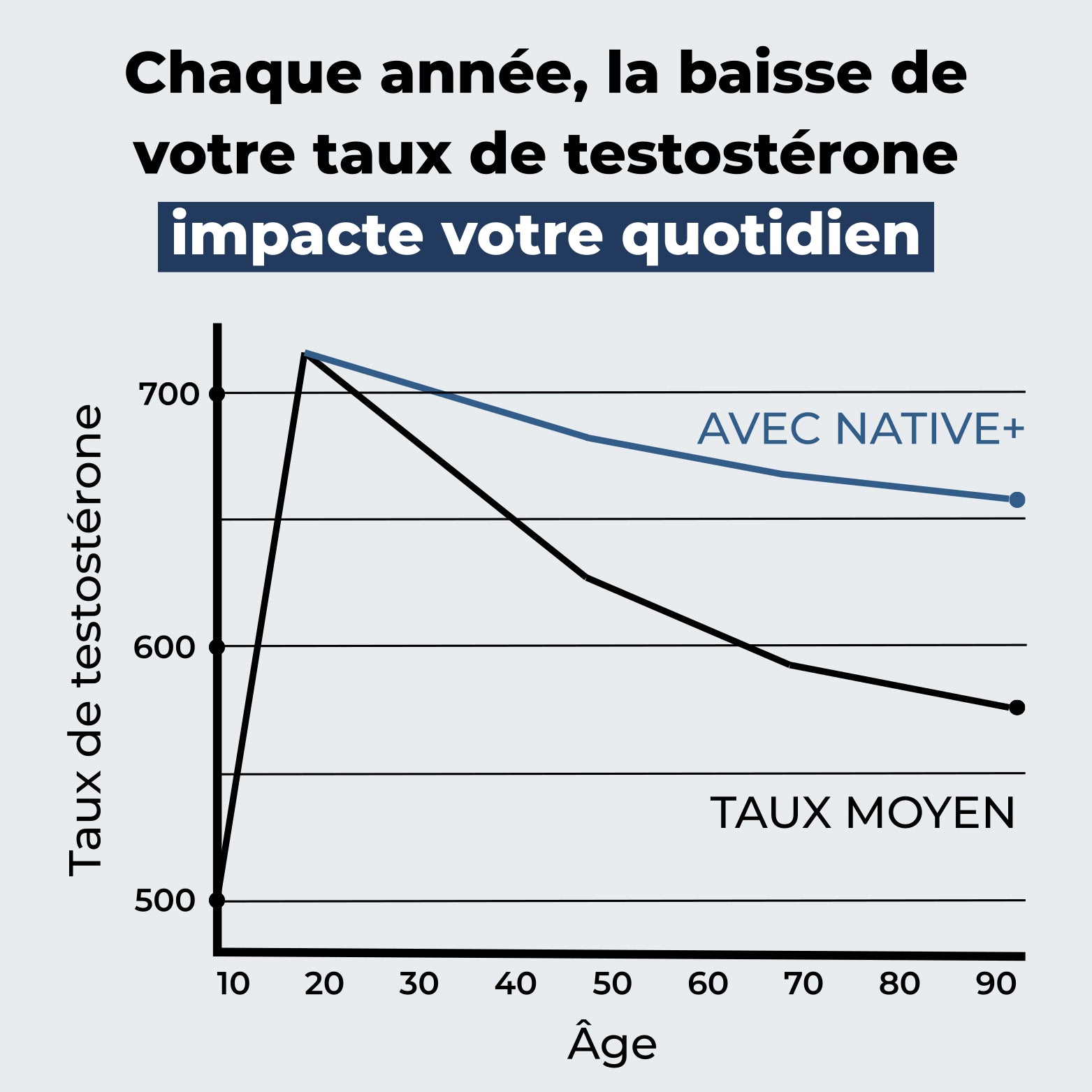 NATIVE+ contribue à maintenir des niveaux hormonaux masculins normaux, pour une énergie et une clarté d’esprit plus stables. Effets ressentis dès les premières semaines.