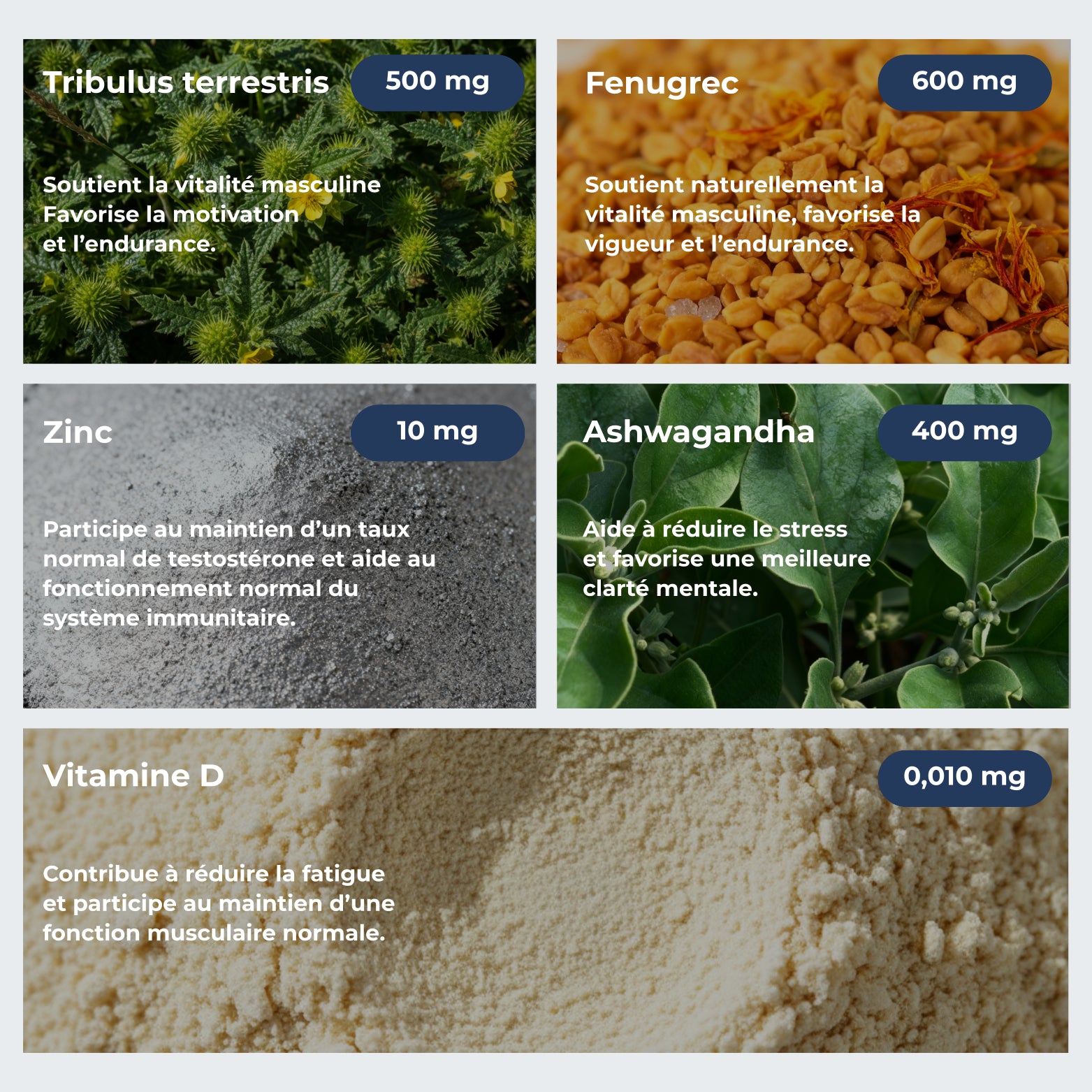Notre complément est fabriqué en France à partir d’actifs naturels reconnus, sélectionnés pour leur qualité et leur biodisponibilité. Le Fenugrec, le Zinc ou l’Ashwagandha figurent parmi les ingrédients les mieux documentés pour accompagner l’équilibre masculin.