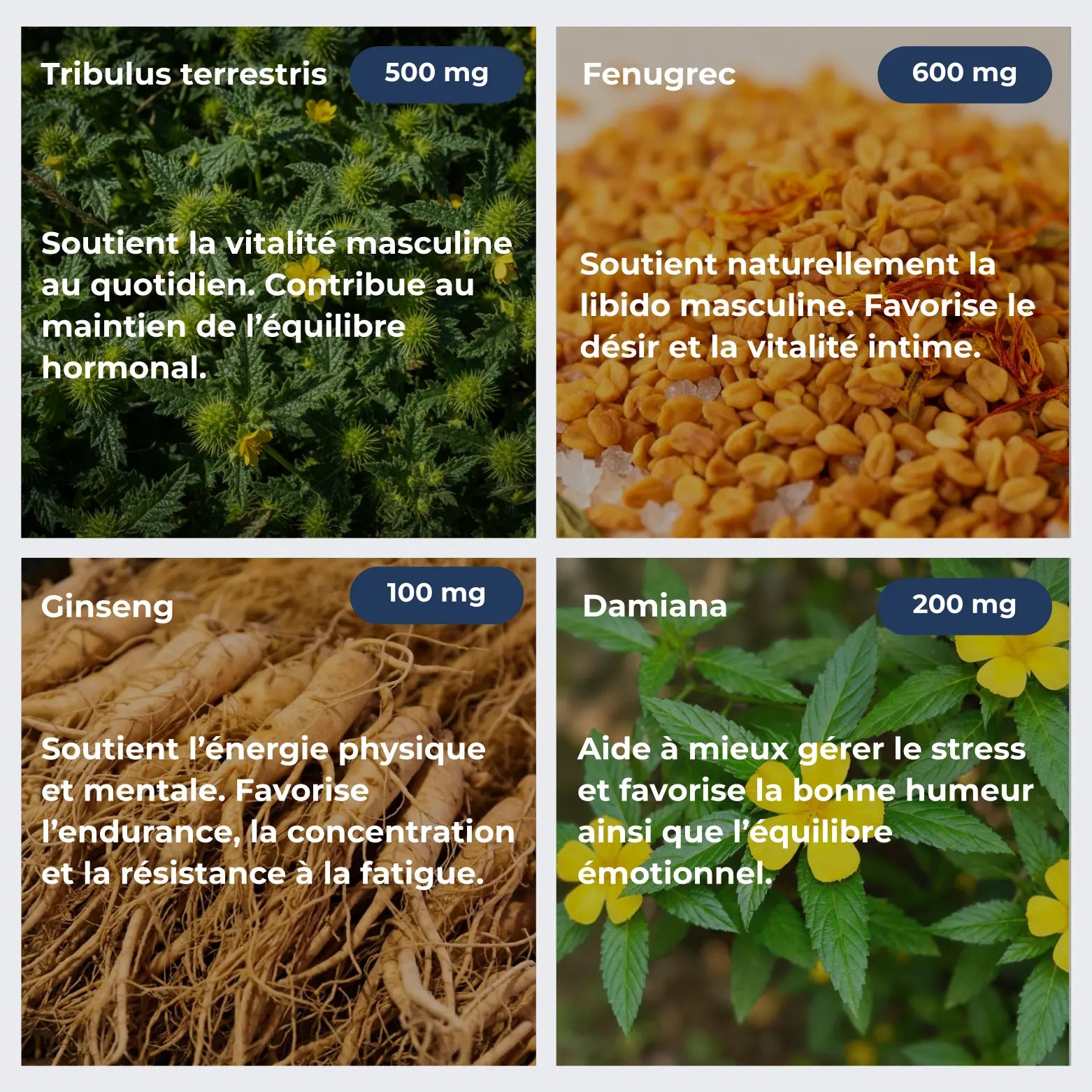 Notre complément est fabriqué en France à partir d’actifs naturels reconnus, sélectionnés pour leur qualité et leur biodisponibilité. Le Fenugrec, le Damiana ou le tribulus figurent parmi les ingrédients les mieux documentés pour accompagner l’équilibre masculin.